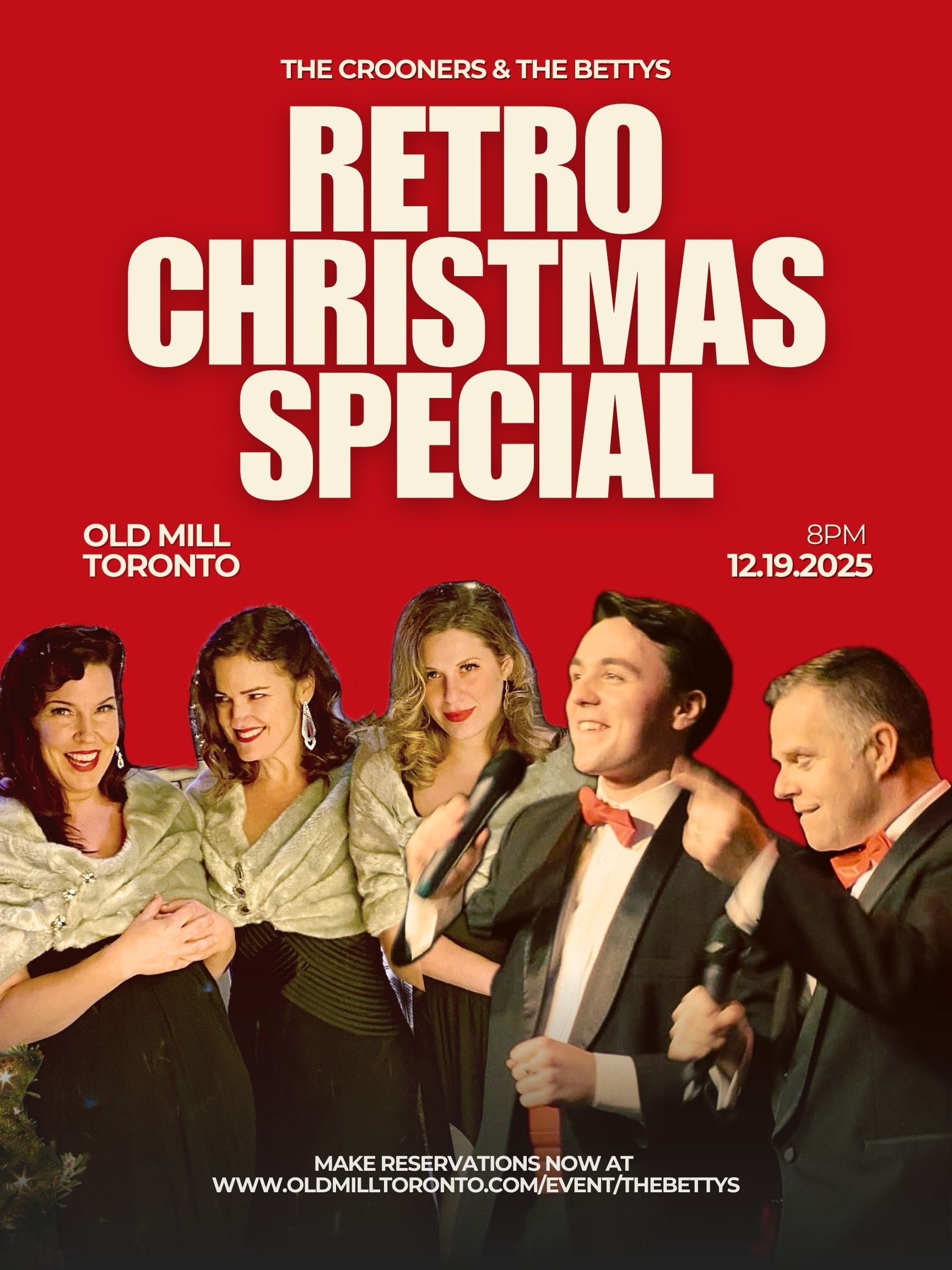 Step into a time-traveling winter wonderland with "The Crooners & The Bettys Retro Christmas Special" - a dazzling holiday show that blends vintage glamour with modern flair! This unforgettable evening brings together The Crooners, featuring timeless classics made famous by Sinatra, Nat King Cole, and other legendary gentlemen of song with lots of surprises, and The Bettys, Toronto's sensational vocal trio known for their retro panache, witty banter, and jaw-dropping harmonies on everything from the 1920s to a Jazzy ACDC.